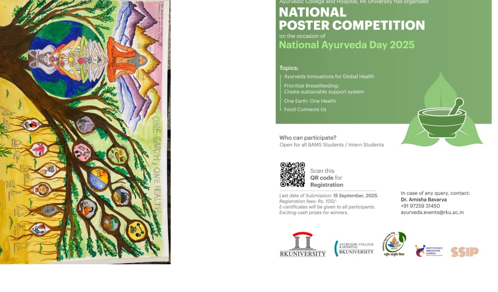 The Department of Kaumarabhritya and Kriya Sharira at RK University Ayurvedic College and Hospital, Rajkot, organized a National Level Poster Making Competition on the occasion of National Ayurveda Day 2025. The competition was centered around thought-provoking themes such as Ayurveda Innovations for Global Health, Prioritize Breastfeeding: Create Sustainable Support System, One Earth: One Health, and Food Connects Us.